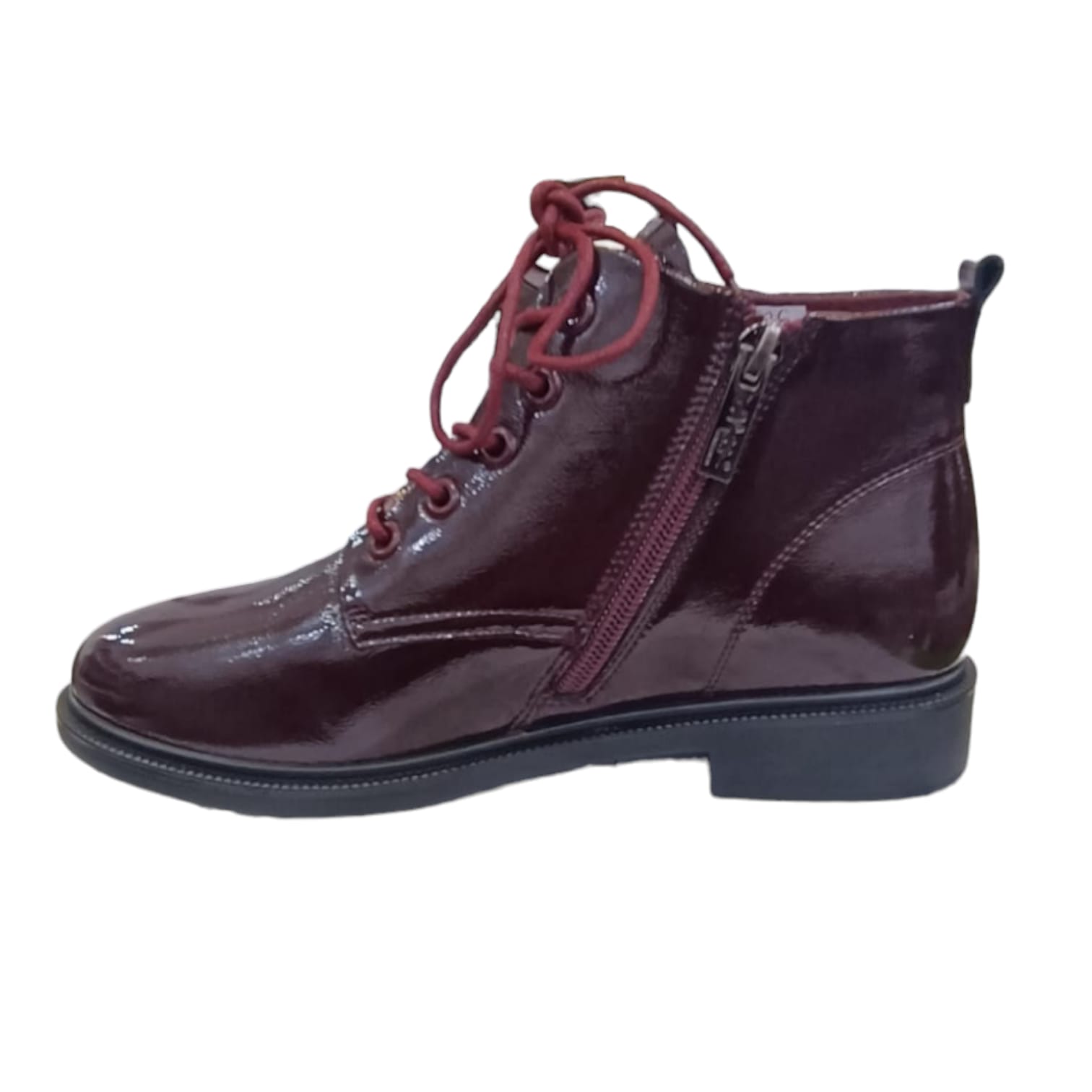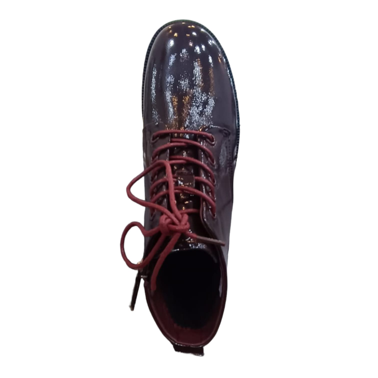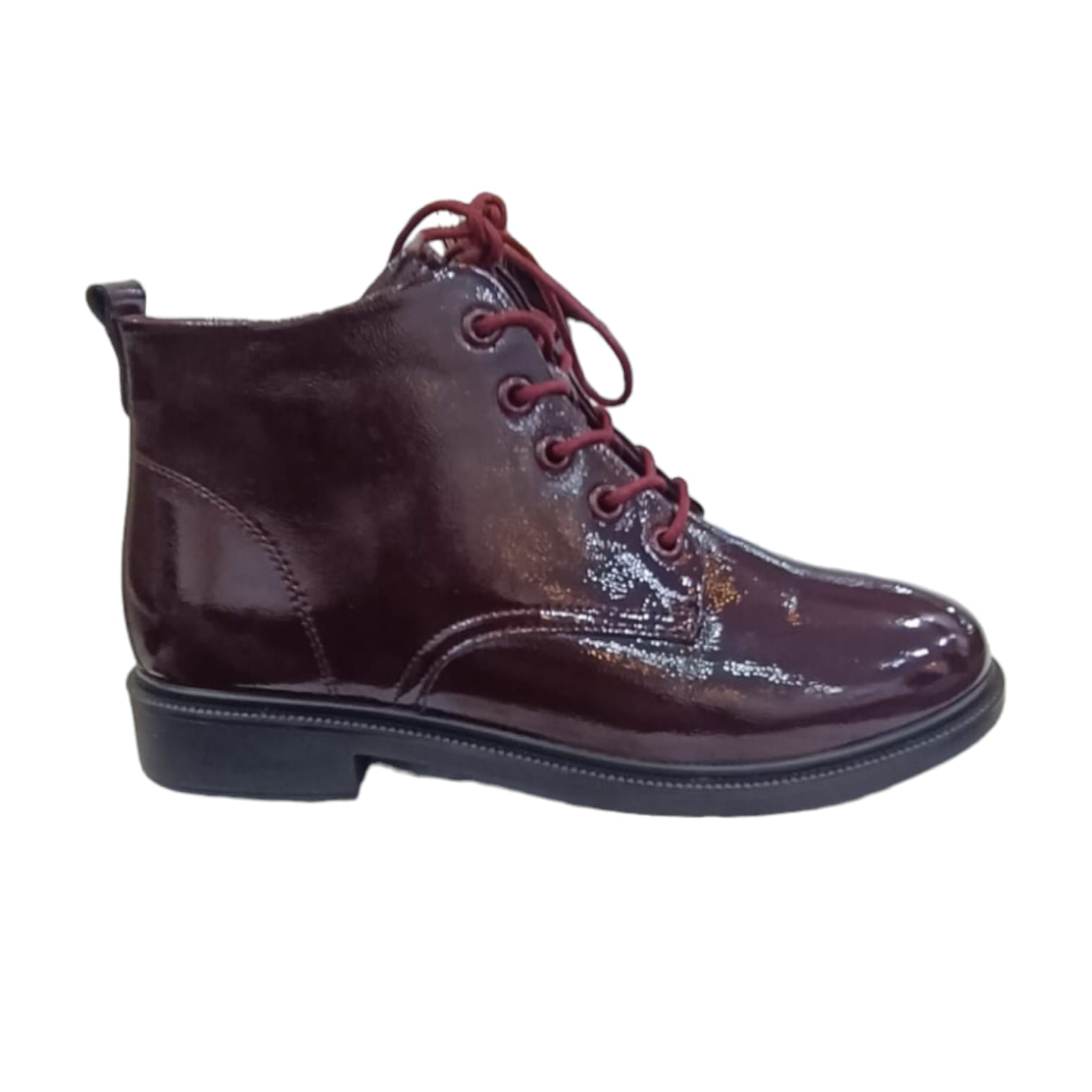 Ghete din piele naturala lacuita, cu brat moale si talpa flexibila. Inchidere cu siret si fermoar, captusite cu blanita sintetica. Inaltime toc 2.5 cm.