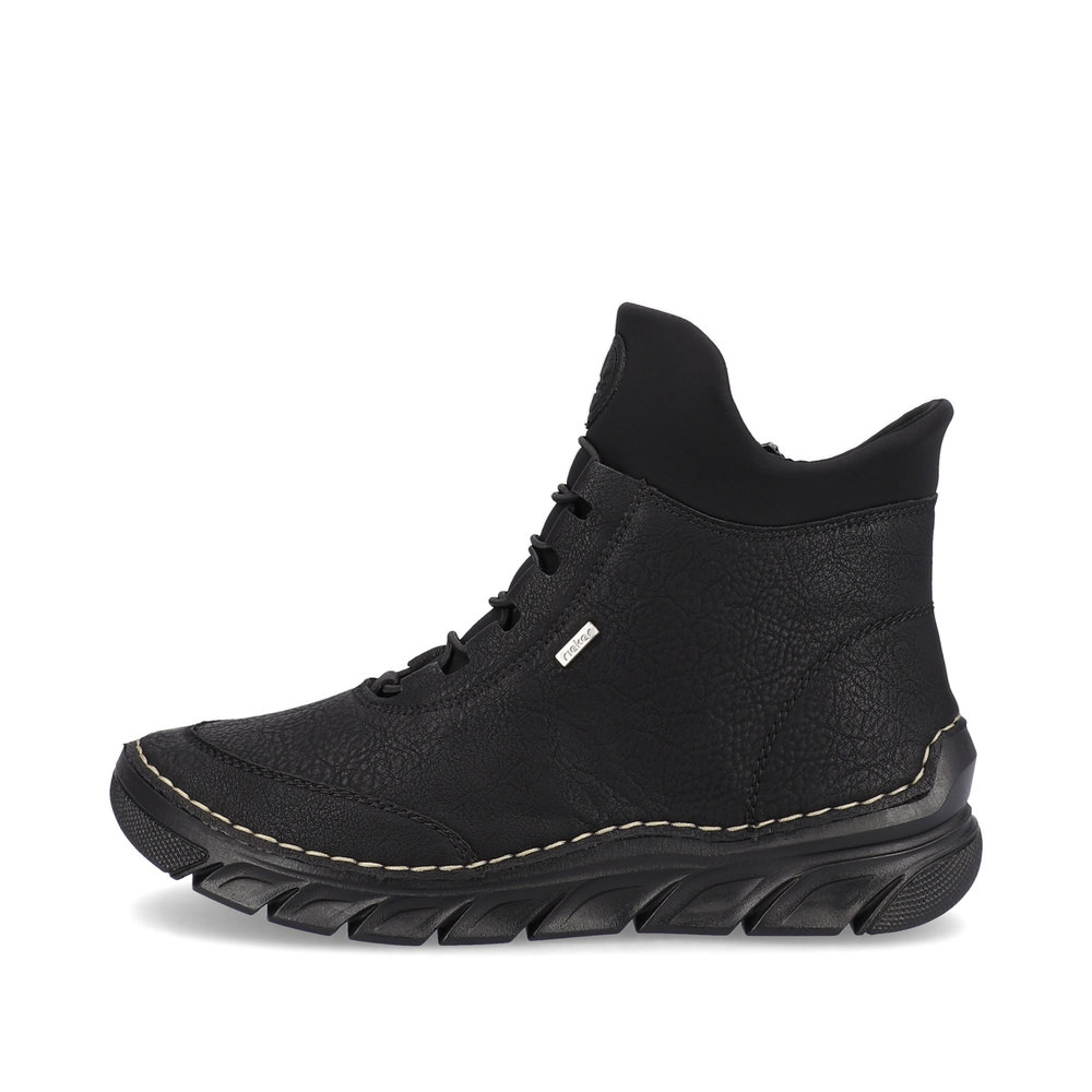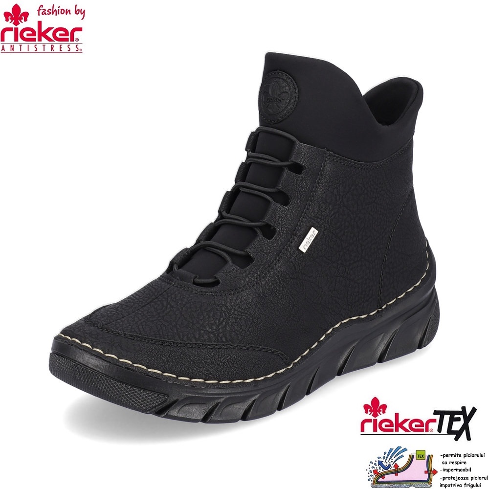 Ghete pentru dama marca Rieker din piele ecologica cu talpa flexibila,brant moale cu tehnologie ANTISTRESS si membrana TEX. Captusite cu blana sintetica. Grosime talpa 35 mm.